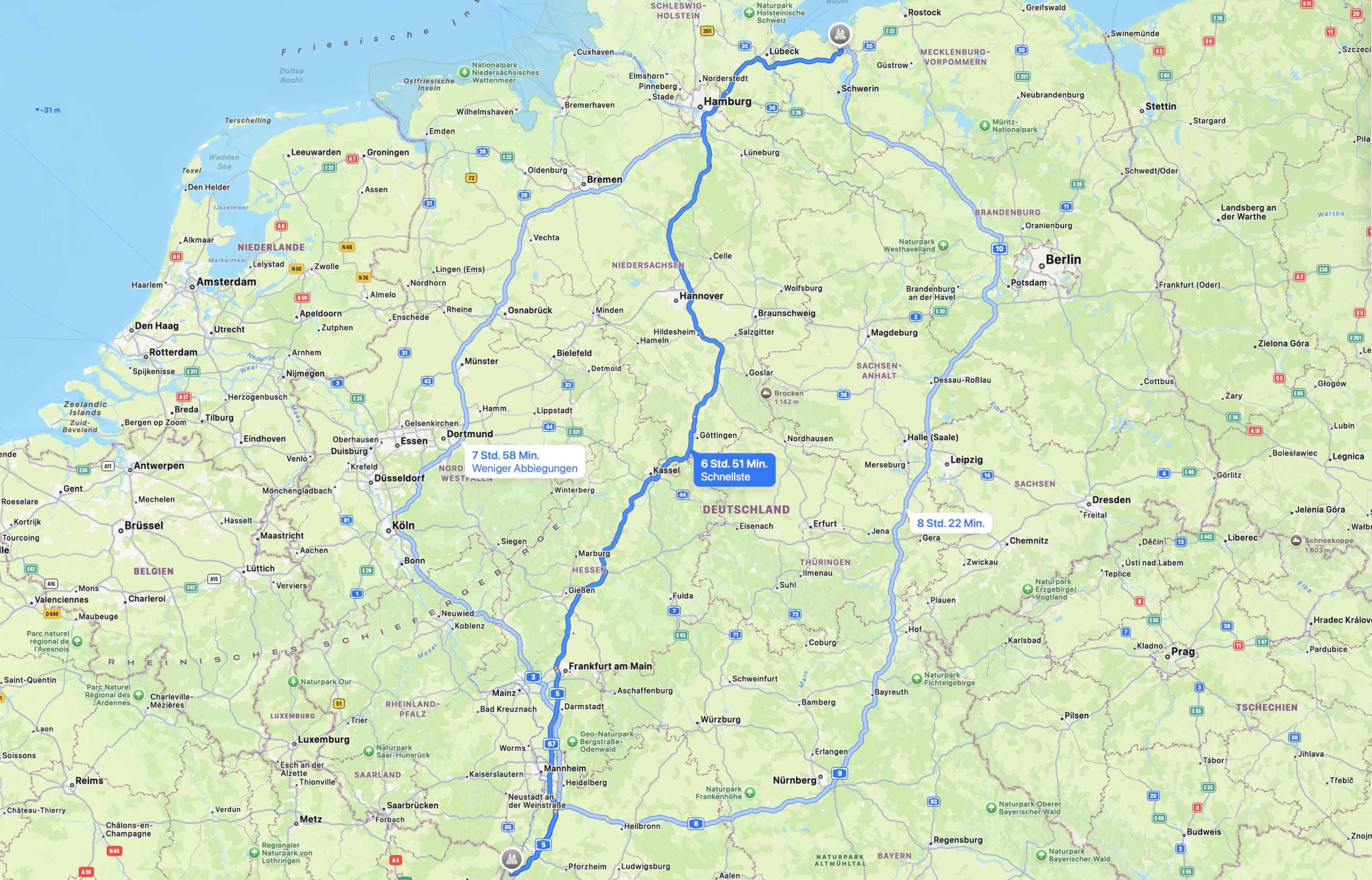 Jetzt arbeiten wir uns erstmal nordwärts, vorbei an Frankfurt, Hannover und Hamburg… Dann rechts weg, vorbei an Lübeck – und dann sollten wir auch schon dort sein! Dort, wo die SOKO so schön entspannt ermittelt. Wir hoffen auf keine unnatürlichen Todesfälle!