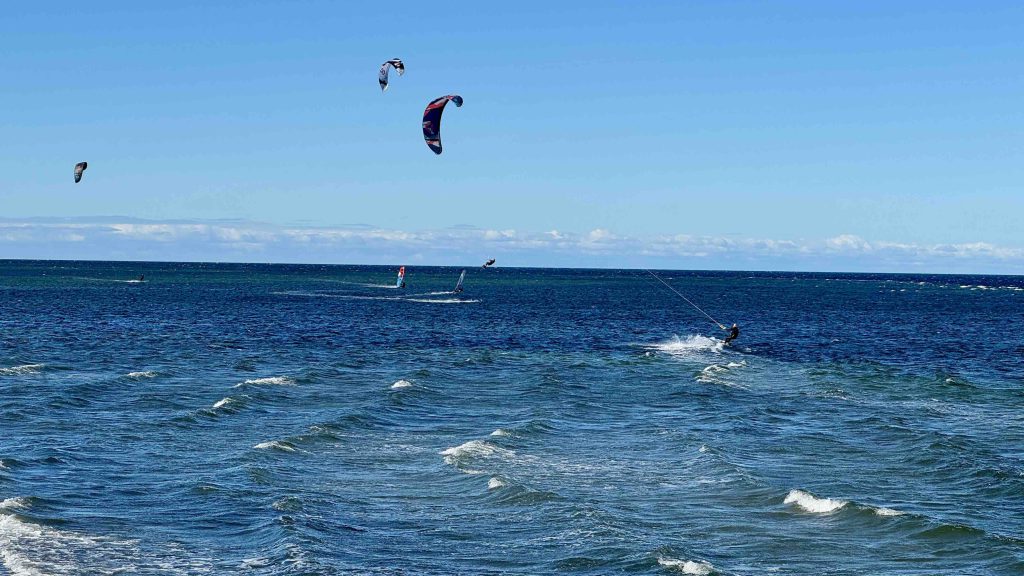Tja, und irgendwann ist auch der schönste Wind zu viel. Trotz Mütze und Kapuze hat es uns irgendwann gereicht und wir haben den Rückzug angetreten. Wind schön, Wellen auch, Kitesurfen offensichtlich aufregend – so wie die das hier machen, können sie es schon… und dann sind wir zwar nicht in den Sonnenuntergang geritten, aber wir haben ihn von unserem Balkon in der Ferienwohnung HAFENSPITZE Wismar genossen. Mit Blick über den alten Hafen und das Wismarer Werftgebäude – dahinter muss technisch gesehen also Westen sein!